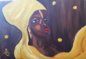 I have been inspired by a beautiful late friend of my of mixed race, she was majestic, colourful, with wonderful headdresses. I wanted to paint her, and in the meantime I researched many different aspects of this subject. I loved the colours, and expression. In the original the eyes were closed and there was an object in the foreground, which I omitted.