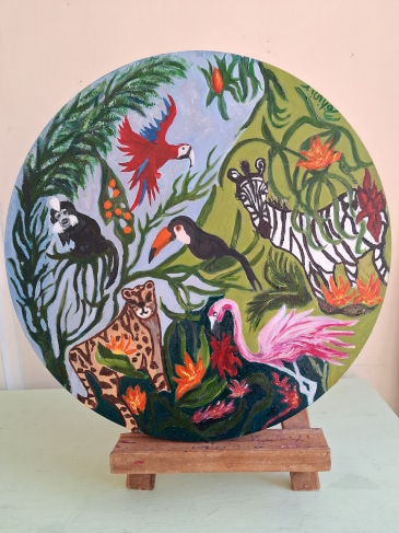 An original oil on canvas 40cm diameter, inspired by a beautiful forest jungle cushion belonging to a dear friend.