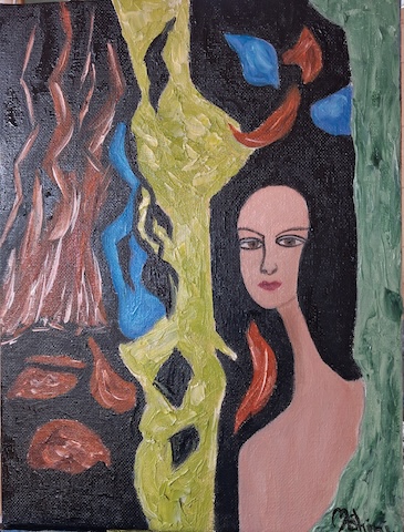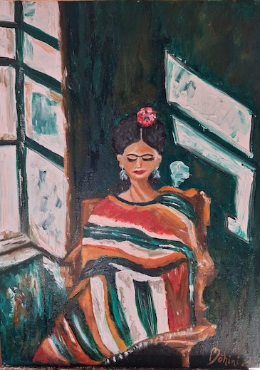 Pray Wait Listen oil on canvas 40x30cm 13.3.2026. inspired by a beautiful painting resembling Frida Kahlo which came into my feed. I could not find the artist, so I was unable to offer credit. This image and composition is very timely at this stage and time of my life (2026) where I pray, I wait and I listen. I often, now meditate on a chair, due to some knee pain, and wear a shawl – always very colourful. My hair is no longer dark and yet this painting her hair remains black as mine used to be. The flowers in the hair are very much “Frida-like” and as I love flowers they too remain.